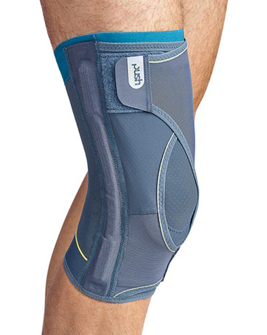 Die Push Sports Kniebandage mit U-förmiger Pelotte sorgt für eine effektive Stabilisierung rund um das Kniegelenk dank seitlicher Verstärkungen. Die Pelotte unterstützt dabei die Kniescheibe und lindert bestehende Beschwerden. Eingearbeitete Blattfederscharniere folgen der natürlichen Kniebewegung, geben aber sicheren Halt bei ungehinderter Flexion und Extension. Antirutsch-Applikationen gewährleisten einen sicheren Sitz.